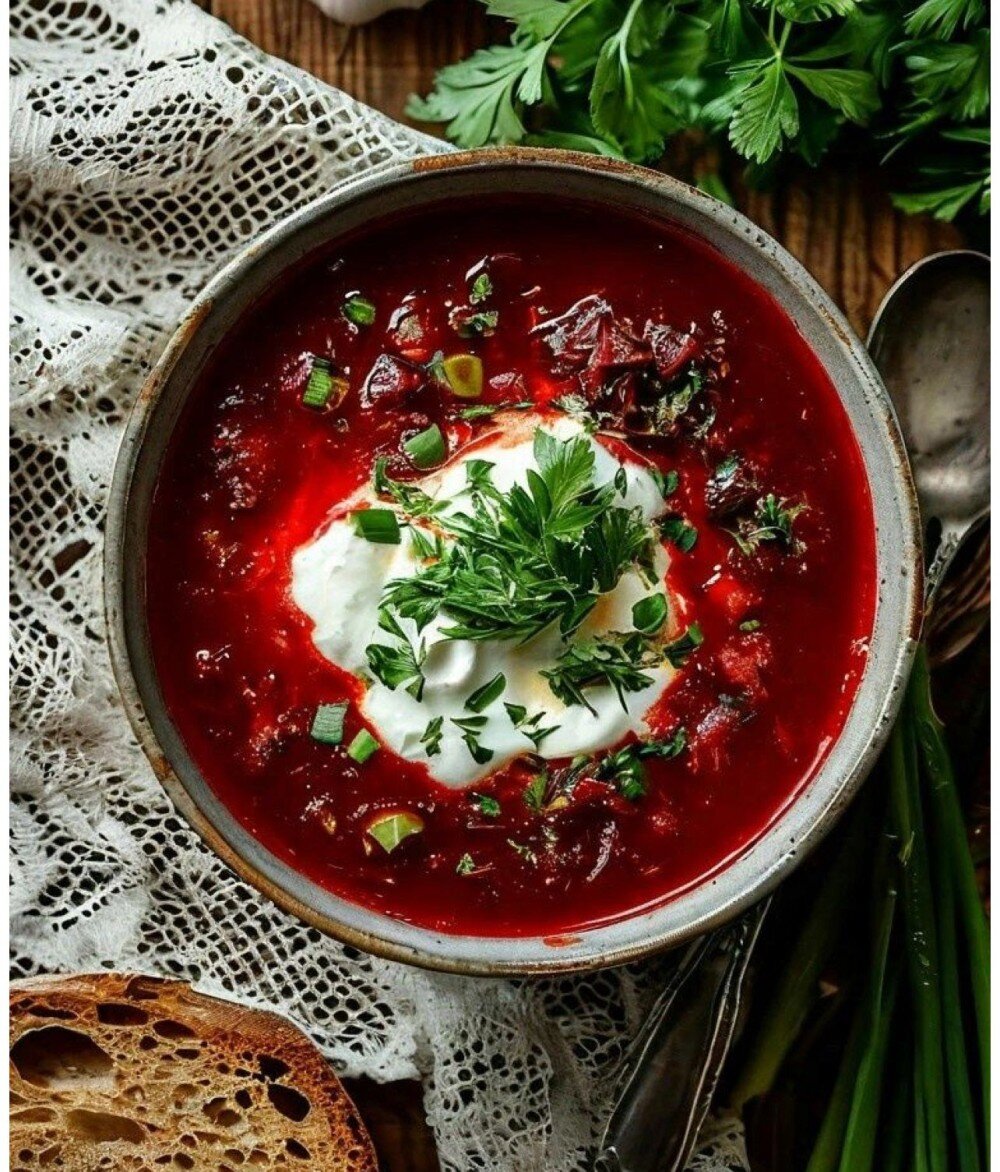 Наваристый борщ с говядиной, сметаной и зеленью Вес 280 г (Сметана включена в комплект). Дополнительно закажите хлеб, сухарики и сало к борщу.