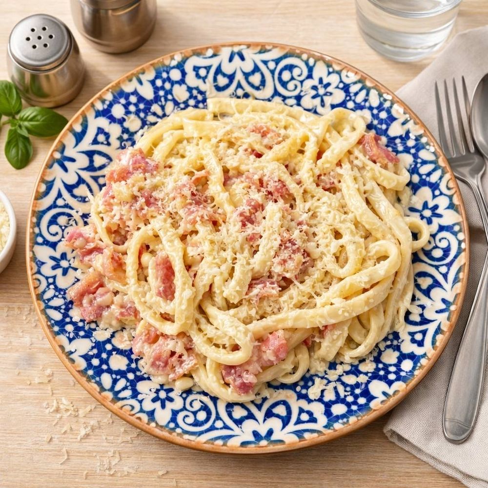 Нежная паста в насыщенном сливочном соусе с хрустящим беконом и сыром.