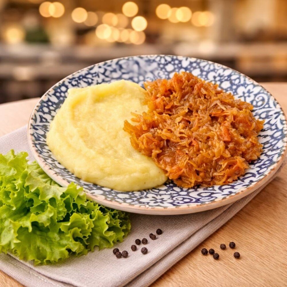 Сытное, мягкое сочетание картофельного пюре и тушеной капусты